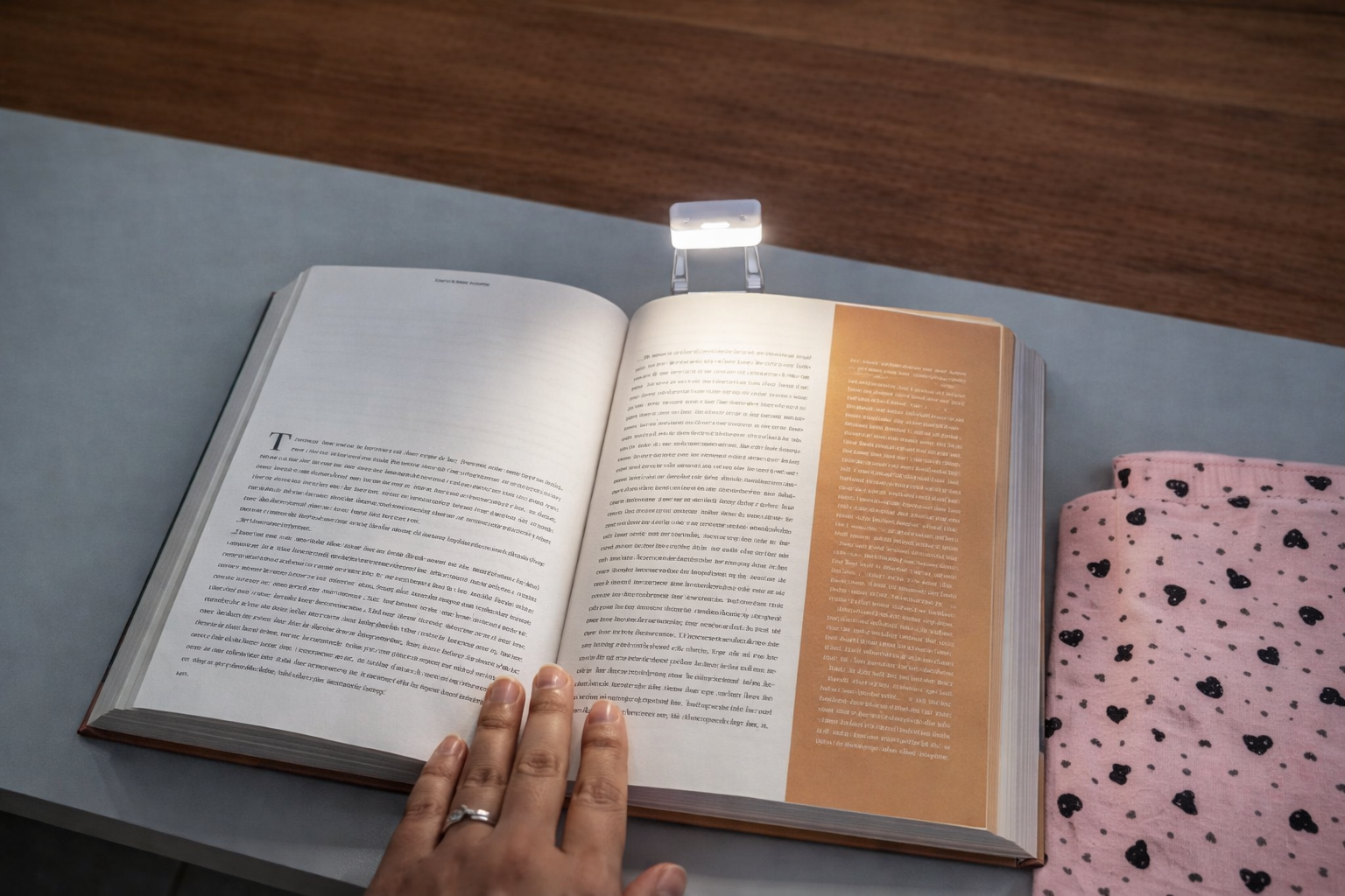 En smidig klämlampa för böcker med mjukt, justerbart ljus – perfekt för nattläsning.